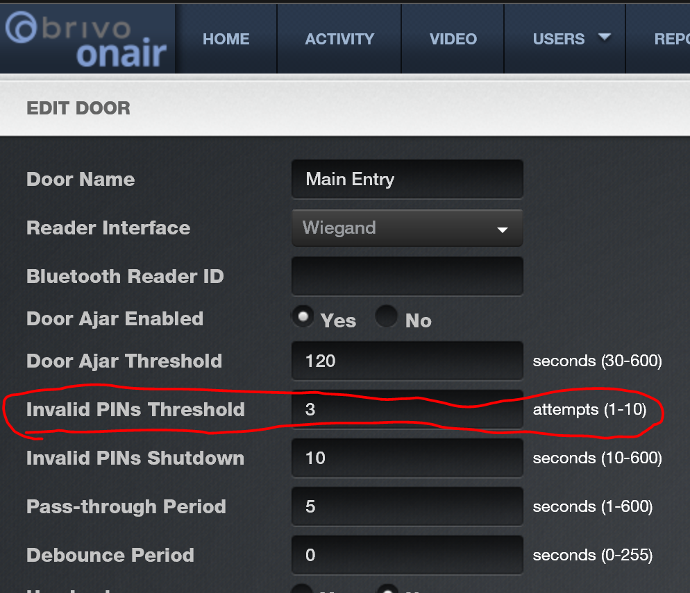 Utilize Brivo's Invalid PINs Threshold. You can set a limit for the number of attempts before the system temporarily shuts down and doesn’t allow any input. The number of attempts can be set between 1-10. Go to SETUP >> Sites/Doors >> Sites, then click on the door name to setup and Edit that door.