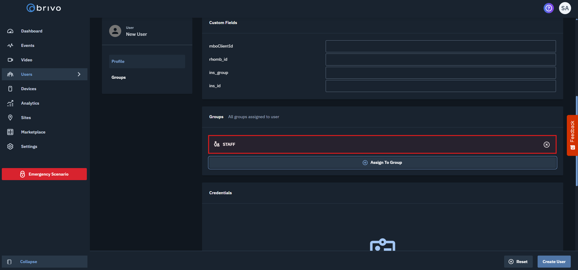 Once the Users window opens, click the blue Create New User button in the top right. You’ll see three sections to set up a new user: Profile, Groups, and Credentials.