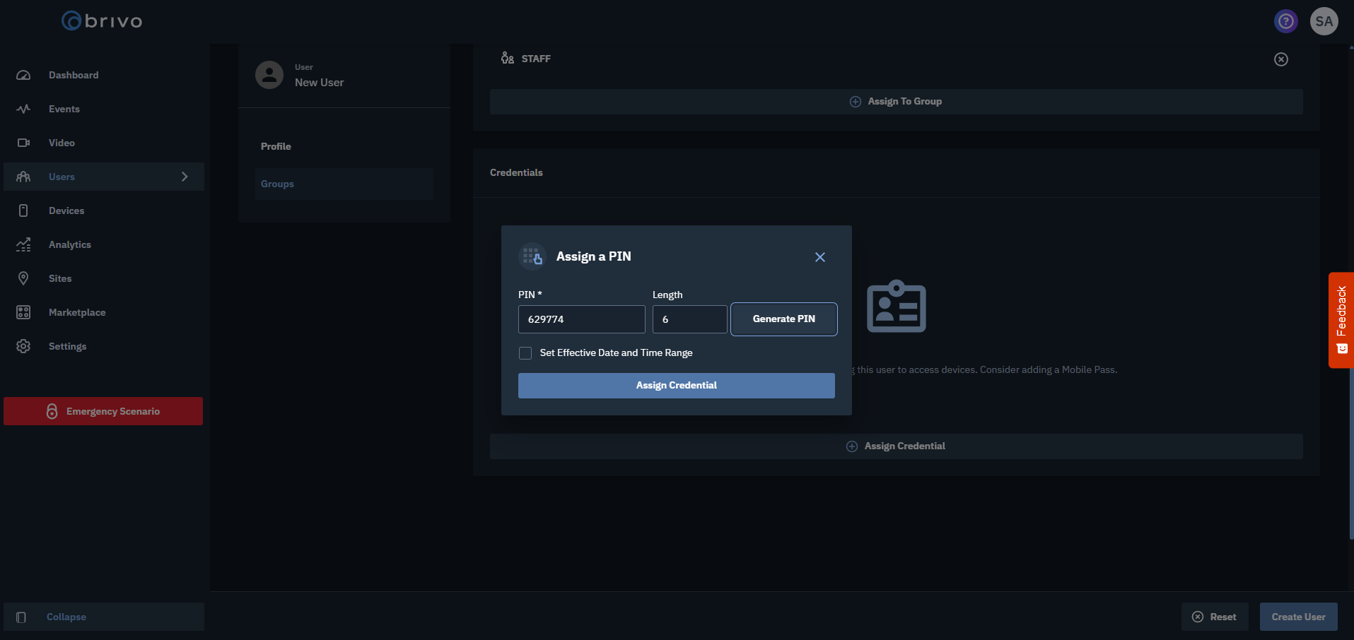 Important: After assigning the credential, Brivo will not show the full PIN again. Be sure to write it down or save it before closing.