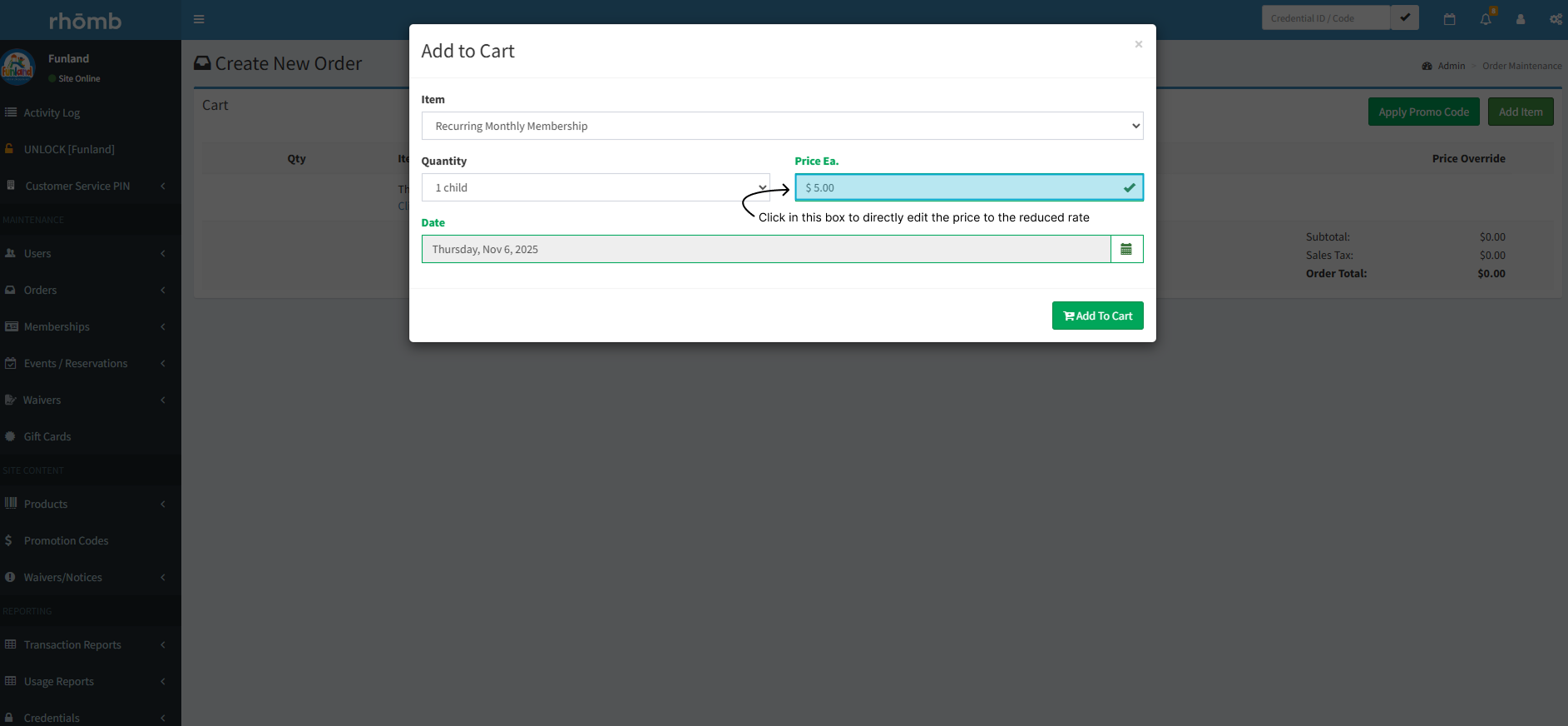 3. In the Add to Cart popup, edit the membership price directly to reflect the discounted rate.