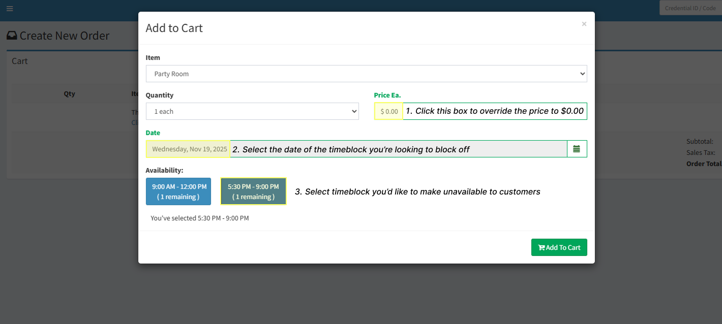 2. Create a New Order: Click Add Item and select the product (event or reservation) you want to block off.